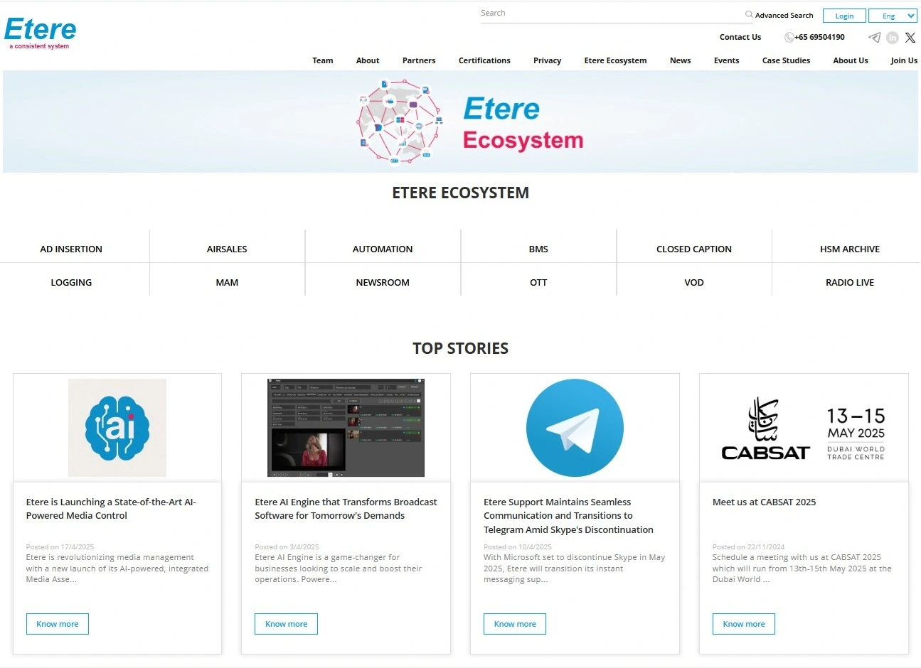 Etere’s website, www.etere.com, is a dynamic web portal for Etere’s customers to communicate with Etere in a simply, intuitive and efficient manner. This section and the following ones of the user guide provide details about the Etere website and how to perform key operations in it.