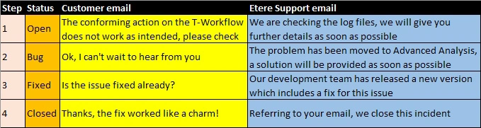 When customers encounter an error originating from Etere products, or they want to forward a request for modification/improvement, they can communicate the problem/modification request to Etere Support Team by submitting an incident containing detailed information; this incident will be assigned a unique incident number. Then, the communication between the customer and Etere Support Team on the troubleshooting, including emails, the release of fixes/patches and the closing of the incident are recorded on the specific incident number for tracking and documentation purposes.