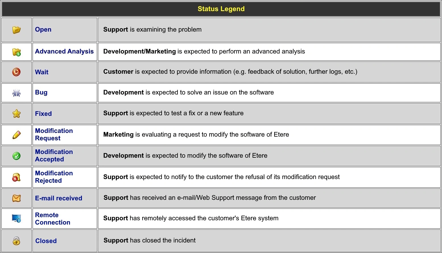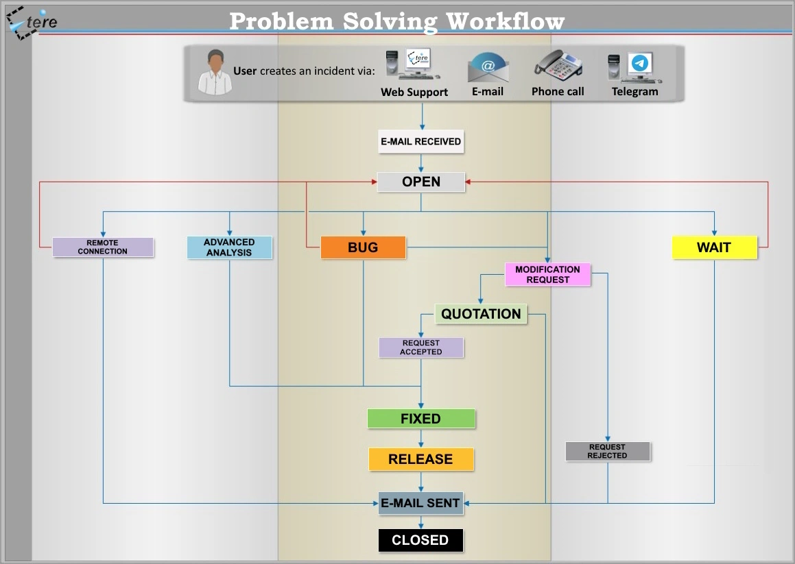 The images featured in this page illustrate Etere's problem solving-workflow that is followed to deal with an incident, from its initial opening to its final closing and a detailed description of all the statuses related to incidents solutions.