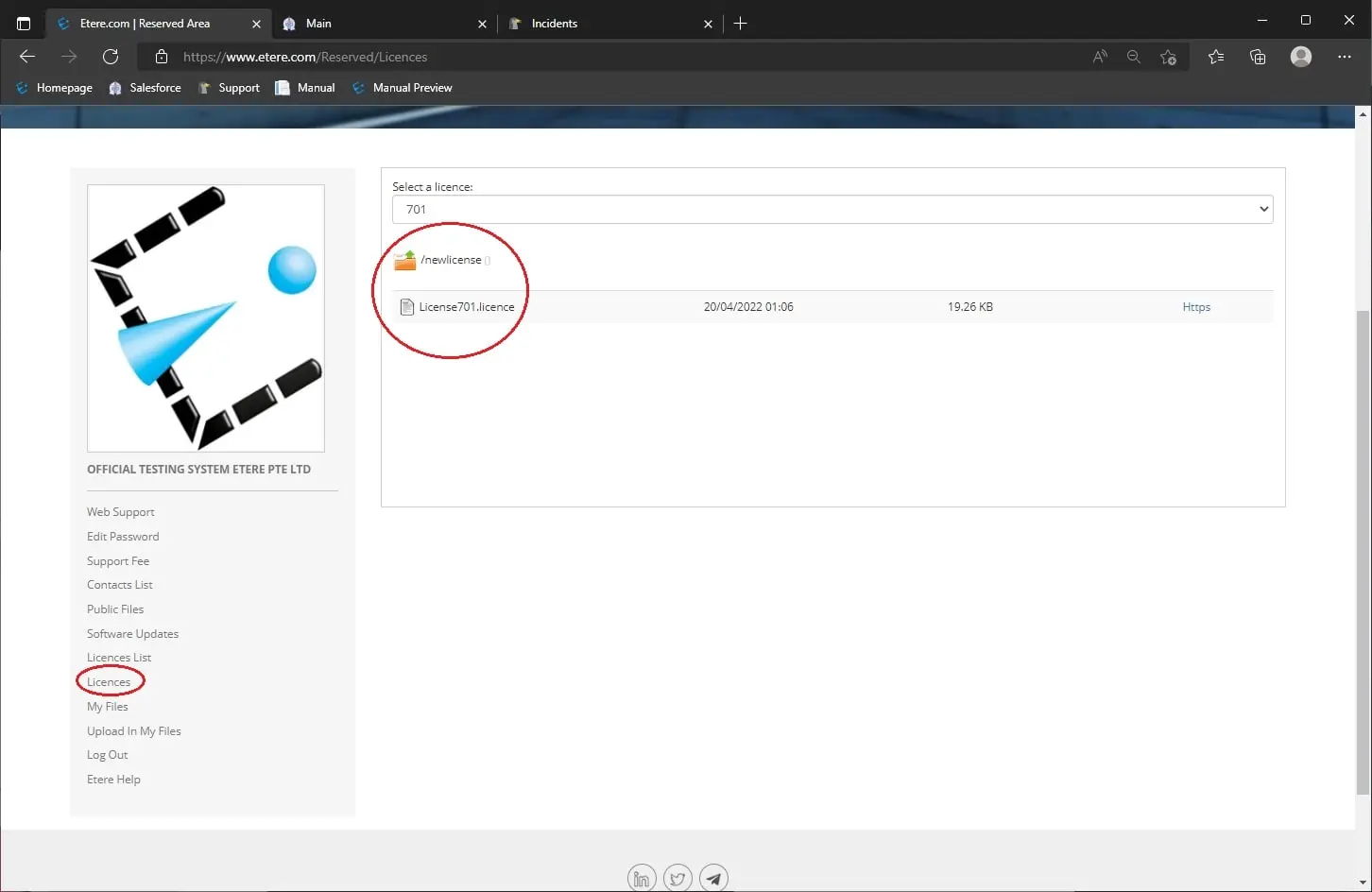 2. In the reserved area also download your license under “licenses” and then “newlicense” [License]