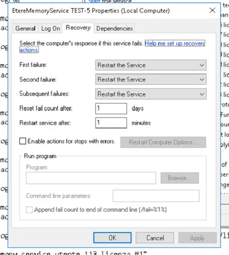Note: Etere Update, when one or more services are being installed, will automatically set the service's Recovery options as shown in the following image:
