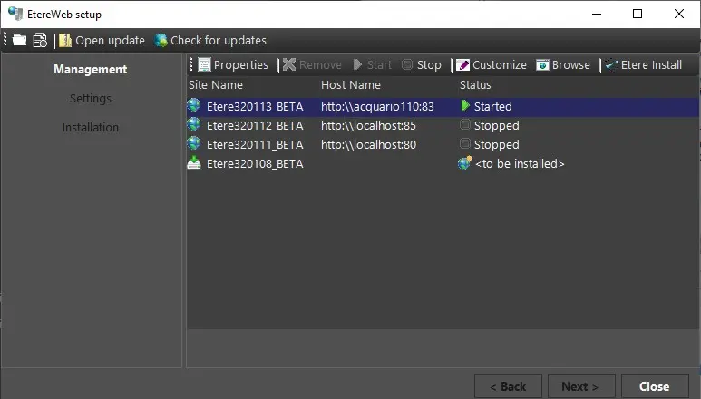In the "Management" tab, all the various versions of the Etere Web installer are displayed under respective network sites. The "Management" tab toolbar allows users to manage the Etere Web applications.