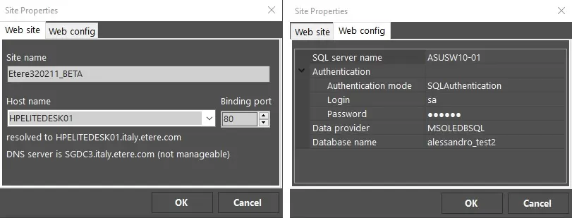 Web site name: It displays the network site name where the Etere Web Setup application is available. Etere Web Setup can manage the DNS, which retrieves the IP address (the hostname is not necessarily needed) to fulfil the settings. DNS Server can be another machine in the network; the user must be granted specific Windows permission to manage DNS.