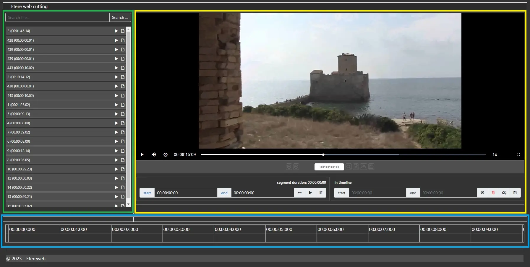Etere Web Cutting application is formed by three main sections: Search tab, Preview tab and Timeline tab. They're highlighted in green, yellow and blue on the picture Web_Cutting_Interface.