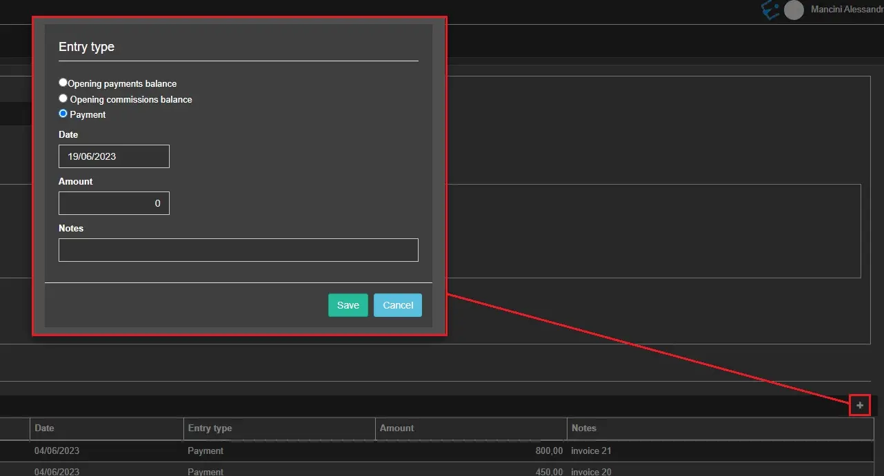 Clicking on the [+] button at the upper-right corner of the table, it is possible to add a new payment through the following form:
