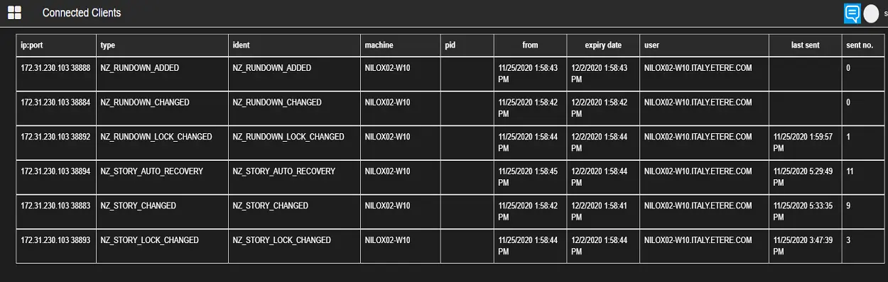 The Connected Clients displays all stations currently connected to Nunzio via web services.