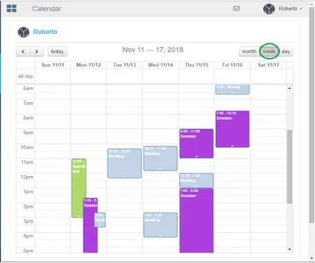 The “Week” calendar displays the appointments scheduled in the current week.