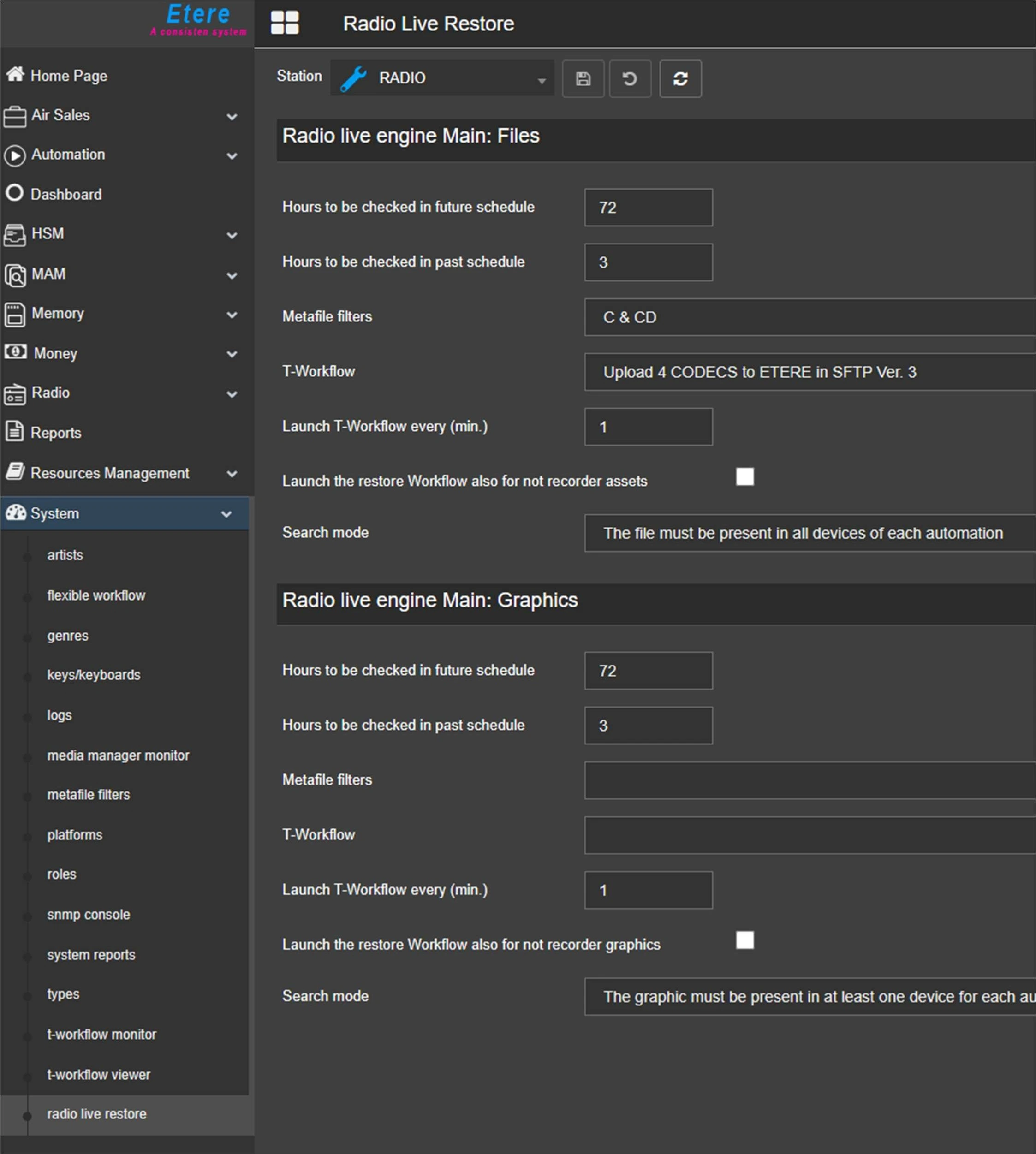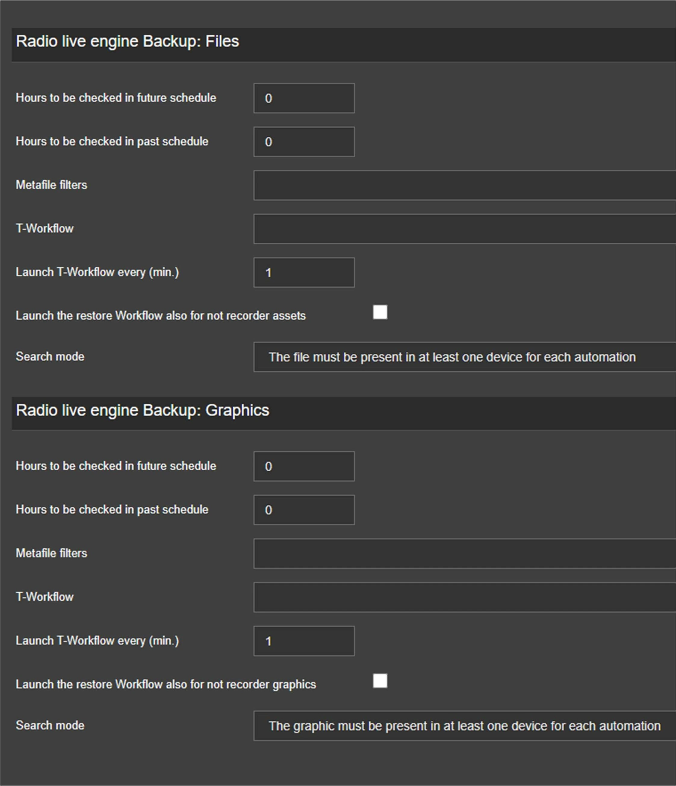 In this section, you can configure the restore of the clips that are next to be broadcasted and which are scheduled in the main engine and the backup engine playlists. You can configure the restore for graphics as well.