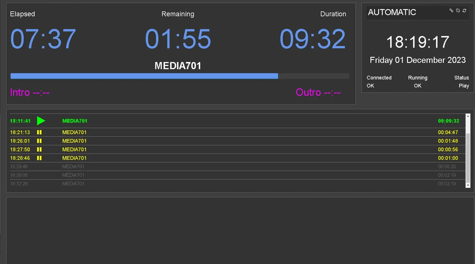 The Automation Remote Panel aims to offer the Radio-Live user a display to keep track of the on-air event, the schedule of the day, the status of the Radio Playout and different time counters, valid for the speaker, to keep track of start and end, intro and outro of the event.