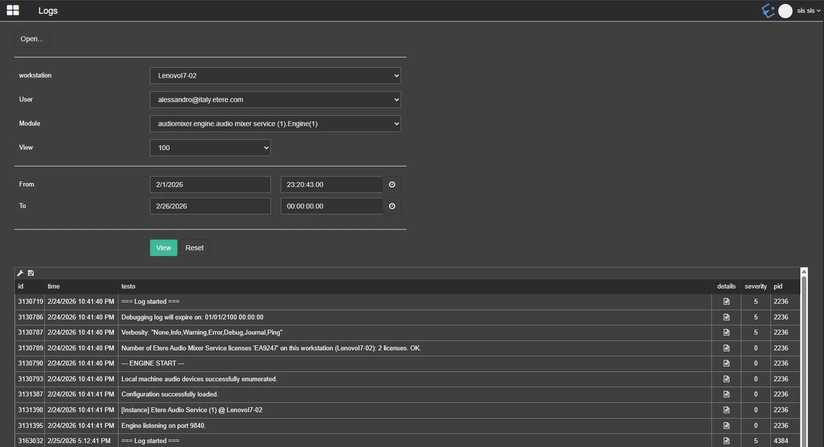 This section allows to view the logs of 64-bits etere modules stored in the logs database.
