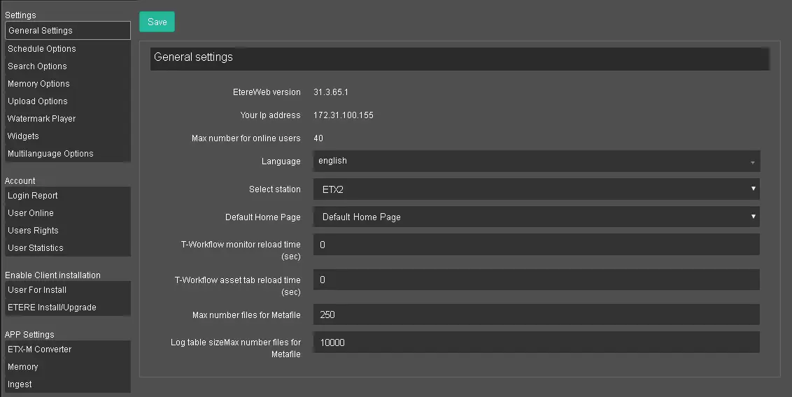 EtereWeb version: It displays the current version of EtereWeb installed in the workstation;