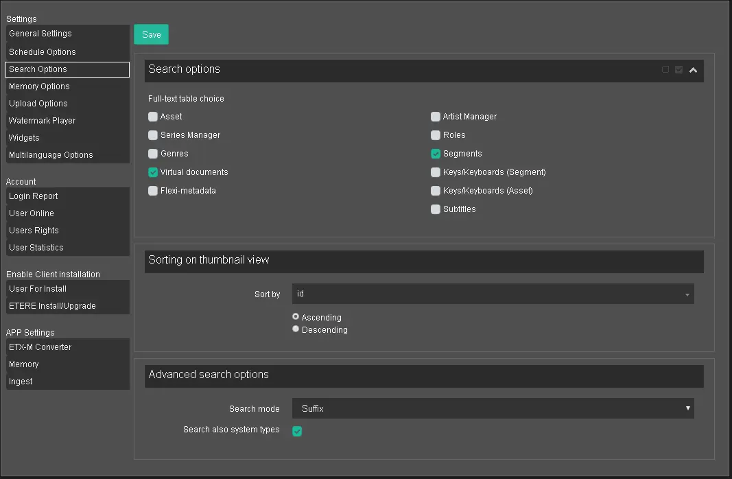 The Search Options section defines full-text search options across all Etere's Fulltext tables. The available filters are listed in the table below.