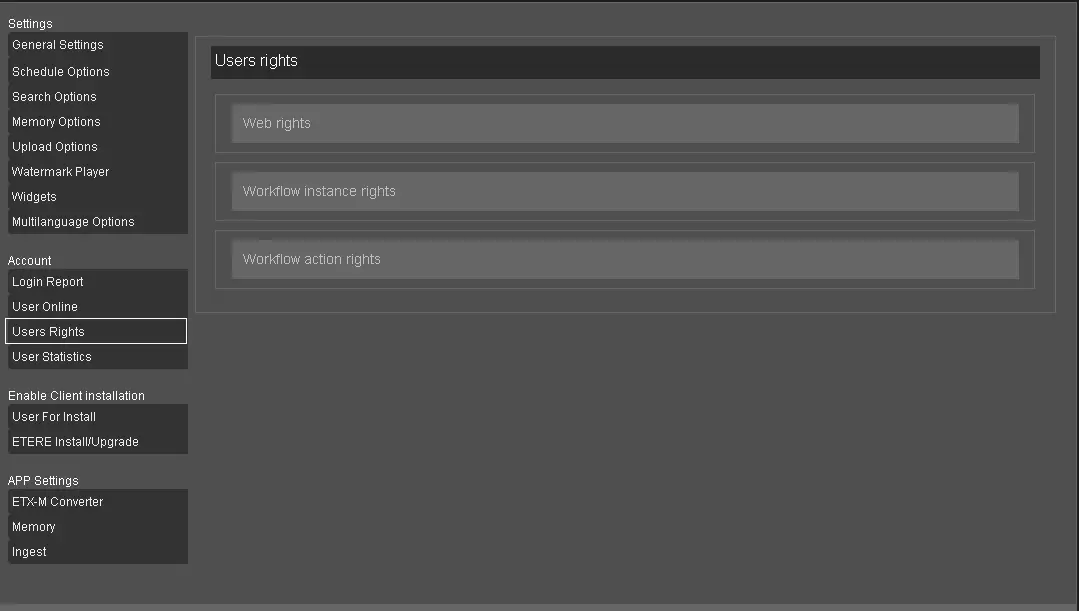The Rights section allows users to consult all the user rights that they are granted (e.g. web access, play, tape search, memory, etc.), workflow instances rights (e.g. Partial retrieve, archive, censorship, post-upload, etc.) and workflow action rights (e.g. quality reset, file renaming, file delete, not ok to broadcast, etc.).