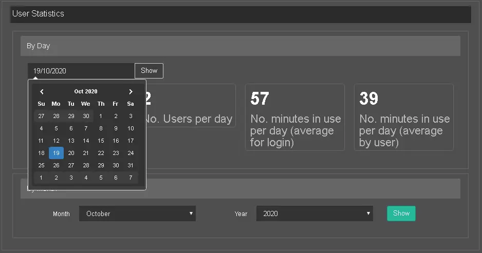 Click on the displayed date text box, and select a date from the calendar month to display user statistics on a specific day.