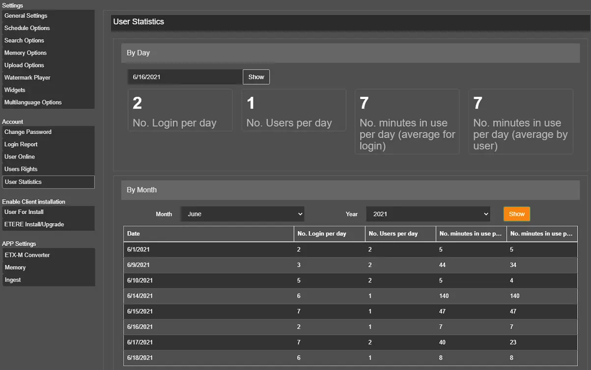 The User Statistics section allows the Administrator to monitor user access to the Etere Web, collect user statistics, and analyse user login behaviours regularly.