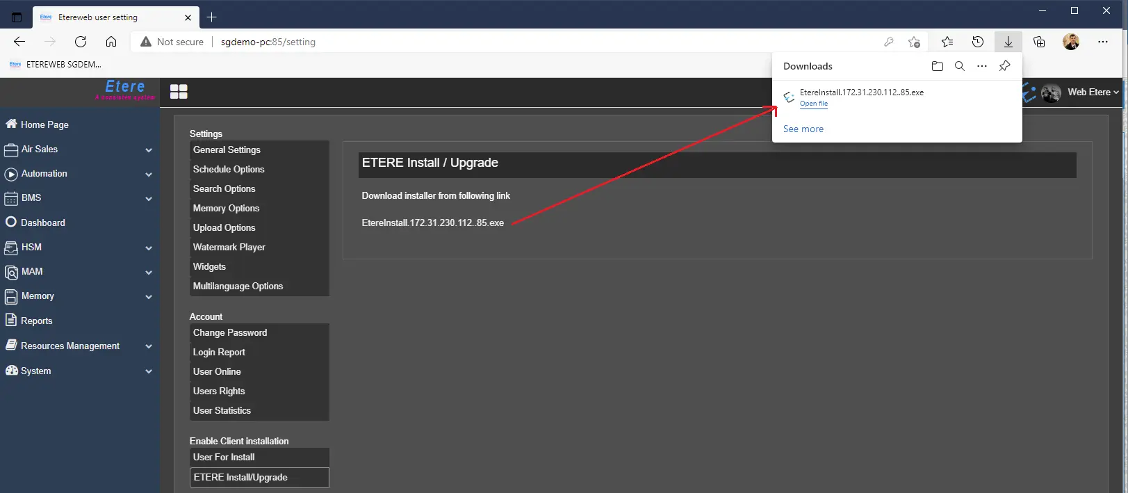 Suppose the linked path is unavailable or there is no file to download. In that case, you must complete the steps in Update Etere Installer on the EtereWeb Server to proceed with the installation or update.