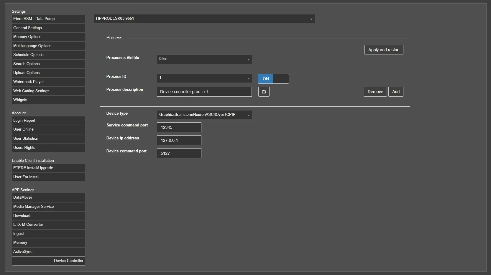On the User Preferences section in EtereWeb will be available the Device Controller section, listing all the servers where the new service has been installed, meaning that each one can be configured.