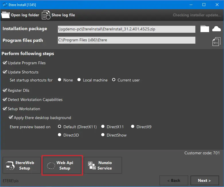 First, launch Etere Installer and click on "Web API Setup" to open the Setup dialogue box.