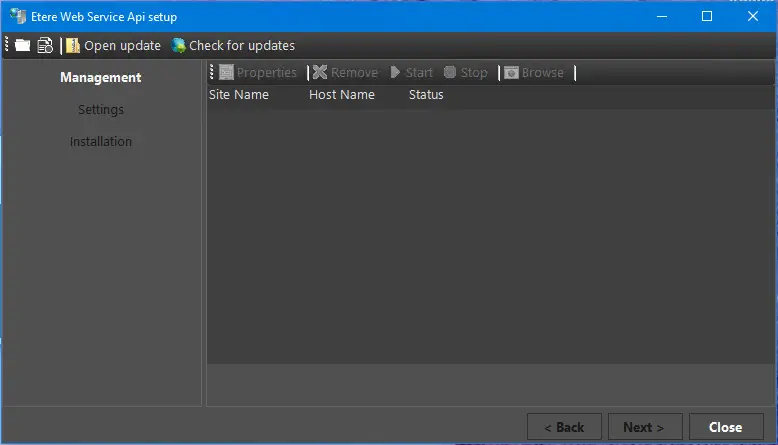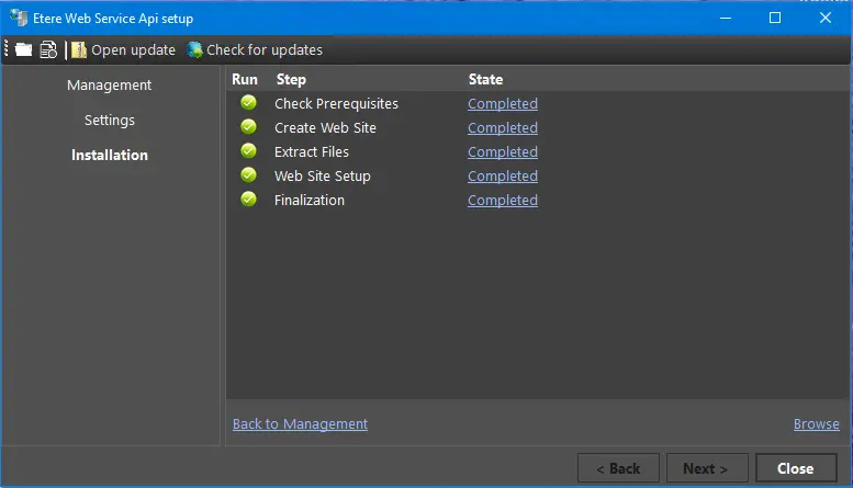 The initialization process is started to launch the Etere Web Service API setup wizard. The setup must be run from the server you want to install or previously installed. You would need Administrator privileges to proceed with the design.