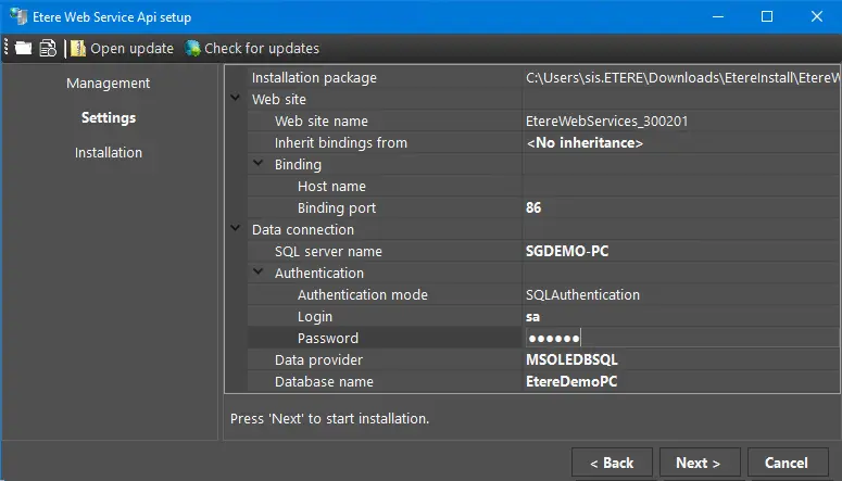 Note: If both "EtereWeb Setup" and "Web API Setup" used port 80 (default port) for communication with SQL Server, both set up cannot be run concurrently; else, one of the setups would fail.