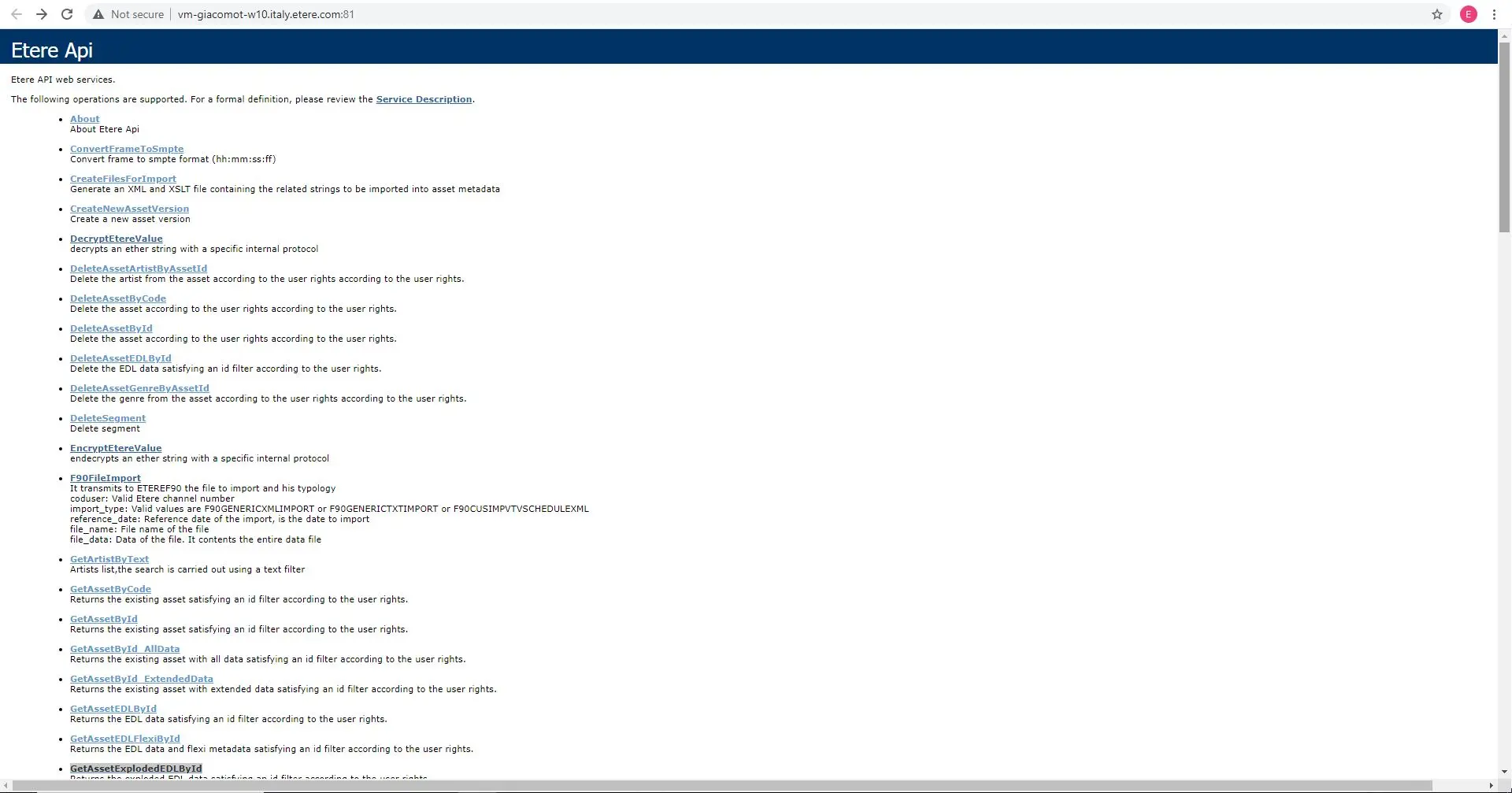 The following shows all the functions allowed by Etere Web API to query multiple asset-related operations, as shown on the Etere API Landing Page: