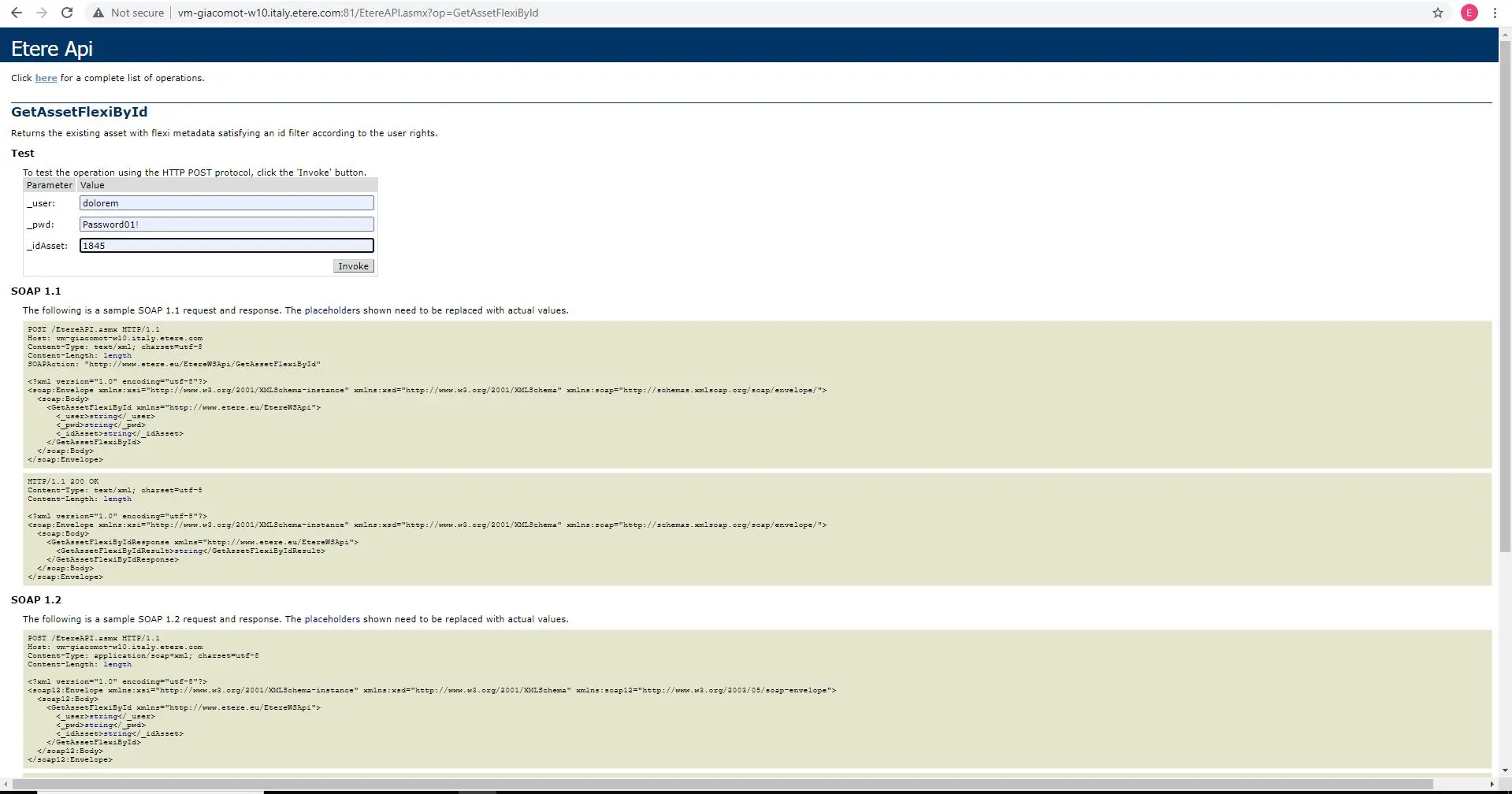 <string xmlns="http://www.etere.eu/EtereWSApi"><?xml version="1.0" encoding="utf-8"?> <WSApiResponse> <Function Name="GetAssetFlexiById"> <Asset><idAsset>1845</idAsset><Code>1843</Code><Description>DELETE ASSET EDL ETERE API</Description><TCIN>0</TCIN><TCOUT>750</TCOUT><Length>750</Length><USER1_NOTES></USER1_NOTES><USER2_NOTES></USER2_NOTES><USER3_NOTES></USER3_NOTES><EDL_flexi><flexiData><item>0F.01.08.00.00.00.00.00</item><itemname>Original source</itemname><itemvalue>Asset form</itemvalue></flexiData><flexiData><item>0F.FD.02.01.00.00.00.00</item><itemname>SC Transcoding</itemname></flexiData><flexiData><item>0F.FD.02.02.00.00.00.00</item><itemname>SC Conforming</itemname></flexiData><flexiData><item>0F.FD.02.03.00.00.00.00</item><itemname>SC Uploading</itemname></flexiData><flexiData><item>0F.FD.03.01.00.00.00.00</item><itemname>VIDEO EDITOR NAME</itemname></flexiData><flexiData><item>0F.FD.03.02.00.00.00.00</item><itemname>VIDEO EDITOR ASSISTANT</itemname><itemvalue>Dolor</itemvalue></flexiData><flexiData><item>0F.FD.05.00.00.00.00.00</item><itemname>TYPES</itemname><itemvalue>COM</itemvalue></flexiData></EDL_flexi></Asset> </Function> </WSApiResponse> </string>