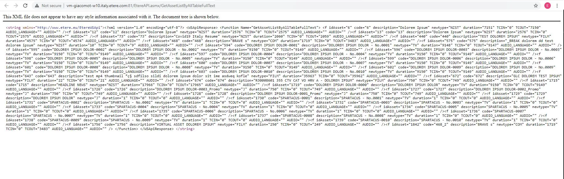 <string xmlns="http://www.etere.eu/EtereWSApi"><?xml version="1.0" encoding="utf-8"?> <WSApiResponse> <Function Name="GetAssetListByAllTableFullText"> <f idAsset="6" code="6" description="Dolorem Ipsum" newtype="NZST" duration="7151" TCIN="0" TCOUT="7150" AUDIO_LANGUAGE="" AUDIO="" /><f idAsset="12" code="12" description="Dolorem Ipsum" newtype="NZST" duration="2576" TCIN="0" TCOUT="2575" AUDIO_LANGUAGE="" AUDIO="" /><f idAsset="13" code="13" description="Dolorem Ipsum" newtype="NZST" duration="2576" TCIN="0" TCOUT="2575" AUDIO_LANGUAGE="" AUDIO="" /><f idAsset="73" code="73" description="Covid19 Italy Resume" newtype="NZST" duration="2060" TCIN="0" TCOUT="2059" AUDIO_LANGUAGE="" AUDIO="" /><f idAsset="440" code="440" description="TEST DOLOREM IPSUM" newtype="FILM" duration="4575" TCIN="0" TCOUT="4574" AUDIO_LANGUAGE="" AUDIO="" /><f idAsset="468" code="468" description="BRAVE s" newtype="COM" duration="1719" TCIN="0" TCOUT="3483" AUDIO_LANGUAGE="" AUDIO="" /><f idAsset="575" code="575" description="_BREAK dolorem dd test dolorem ipsum" newtype="NZST" duration="10" TCIN="0" TCOUT="9" AUDIO_LANGUAGE="" AUDIO="" /><f idAsset="594" code="DOLOREM IPSUM DOLOR-0001" description="DOLOREM IPSUM DOLOR - No.0001" newtype="TV" duration="9148" TCIN="0" TCOUT="9147" AUDIO_LANGUAGE="" AUDIO="" /><f idAsset="595" code="DOLOREM IPSUM DOLOR-0002" description="DOLOREM IPSUM DOLOR - No.0002" newtype="TV" duration="9150" TCIN="0" TCOUT="9149" AUDIO_LANGUAGE="" AUDIO="" /><f idAsset="596" code="DOLOREM IPSUM DOLOR-0003" description="DOLOREM IPSUM DOLOR - No.0003" newtype="TV" duration="9150" TCIN="0" TCOUT="9149" AUDIO_LANGUAGE="" AUDIO="" /><f idAsset="597" code="DOLOREM IPSUM DOLOR-0004" description="DOLOREM IPSUM DOLOR - No.0004" newtype="TV" duration="9150" TCIN="0" TCOUT="9149" AUDIO_LANGUAGE="" AUDIO="" /><f idAsset="598" code="DOLOREM IPSUM DOLOR-0005" description="DOLOREM IPSUM DOLOR - No.0005" newtype="TV" duration="9150" TCIN="0" TCOUT="9149" AUDIO_LANGUAGE="" AUDIO="" /><f idAsset="599" code="DOLOREM IPSUM DOLOR-0006" description="DOLOREM IPSUM DOLOR - No.0006" newtype="TV" duration="9150" TCIN="0" TCOUT="9149" AUDIO_LANGUAGE="" AUDIO="" /><f idAsset="600" code="DOLOREM IPSUM DOLOR-0007" description="DOLOREM IPSUM DOLOR - No.0007" newtype="TV" duration="9150" TCIN="0" TCOUT="9149" AUDIO_LANGUAGE="" AUDIO="" /><f idAsset="601" code="DOLOREM IPSUM DOLOR-0008" description="DOLOREM IPSUM DOLOR - No.0008" newtype="TV" duration="9150" TCIN="0" TCOUT="9149" AUDIO_LANGUAGE="" AUDIO="" /><f idAsset="602" code="DOLOREM IPSUM DOLOR-0009" description="DOLOREM IPSUM DOLOR - No.0009" newtype="TV" duration="9150" TCIN="0" TCOUT="9149" AUDIO_LANGUAGE="" AUDIO="" /><f idAsset="603" code="DOLOREM IPSUM DOLOR-0010" description="DOLOREM IPSUM DOLOR - No.0010" newtype="TV" duration="9150" TCIN="0" TCOUT="9149" AUDIO_LANGUAGE="" AUDIO="" /><f idAsset="643" code="643" description="test mp4 thumbnail °ç§ sdfilso sildi dolorem ipsum dolor sit ime asdweq kofle" newtype="FILM" duration="35963" TCIN="0" TCOUT="35962" AUDIO_LANGUAGE="" AUDIO="" /><f idAsset="672" code="672" description="GLC DOLOREM TEST IPSUM" newtype="FILM" duration="22" TCIN="0" TCOUT="21" AUDIO_LANGUAGE="" AUDIO="" /><f idAsset="674" code="674" description="R30008601 355 CTV CAT VO HRV A - DOLOREM IPSUM" newtype="FILM" duration="750" TCIN="0" TCOUT="749" AUDIO_LANGUAGE="" AUDIO="" /><f idAsset="1715" code="1715" description="HEADLINE NEWS" newtype="NZST" duration="17966" TCIN="0" TCOUT="17965" AUDIO_LANGUAGE="" AUDIO="" /><f idAsset="1719" code="DOLOREM IPSUM DOLOR-0000" description="DOLOREM IPSUM DOLOR" newtype="TV" duration="9150" TCIN="0" TCOUT="9149" AUDIO_LANGUAGE="" AUDIO="" /><f idAsset="1726" code="1726" description="DOLOREM IPSUM DOLOR-0003_Promo" newtype="J" duration="750" TCIN="0" TCOUT="749" AUDIO_LANGUAGE="" AUDIO="" /><f idAsset="1727" code="1727" description="DOLOREM IPSUM DOLOR-0002_Promo" newtype="J" duration="750" TCIN="0" TCOUT="749" AUDIO_LANGUAGE="" AUDIO="" /><f idAsset="1728" code="1728" description="DOLOREM IPSUM DOLOR-0001_Promo" newtype="J" duration="750" TCIN="0" TCOUT="749" AUDIO_LANGUAGE="" AUDIO="" /><f idAsset="1729" code="1729" description="DOLOREM IPSUM DOLOR" newtype="J" duration="1" TCIN="0" TCOUT="0" AUDIO_LANGUAGE="" AUDIO="" /><f idAsset="1730" code="SPARTACUS-0001" description="SPARTACUS - No.0001" newtype="TV" duration="1" TCIN="0" TCOUT="0" AUDIO_LANGUAGE="" AUDIO="" /><f idAsset="1731" code="SPARTACUS-0002" description="SPARTACUS - No.0002" newtype="TV" duration="1" TCIN="0" TCOUT="0" AUDIO_LANGUAGE="" AUDIO="" /><f idAsset="1732" code="SPARTACUS-0003" description="SPARTACUS - No.0003" newtype="TV" duration="1" TCIN="0" TCOUT="0" AUDIO_LANGUAGE="" AUDIO="" /><f idAsset="1733" code="SPARTACUS-0004" description="SPARTACUS - No.0004" newtype="TV" duration="1" TCIN="0" TCOUT="0" AUDIO_LANGUAGE="" AUDIO="" /><f idAsset="1734" code="SPARTACUS-0005" description="SPARTACUS - No.0005" newtype="TV" duration="1" TCIN="0" TCOUT="0" AUDIO_LANGUAGE="" AUDIO="" /><f idAsset="1735" code="SPARTACUS-0006" description="SPARTACUS - No.0006" newtype="TV" duration="1" TCIN="0" TCOUT="0" AUDIO_LANGUAGE="" AUDIO="" /><f idAsset="1736" code="SPARTACUS-0007" description="SPARTACUS - No.0007" newtype="TV" duration="1" TCIN="0" TCOUT="0" AUDIO_LANGUAGE="" AUDIO="" /><f idAsset="1737" code="SPARTACUS-0008" description="SPARTACUS - No.0008" newtype="TV" duration="1" TCIN="0" TCOUT="0" AUDIO_LANGUAGE="" AUDIO="" /><f idAsset="1738" code="SPARTACUS-0009" description="SPARTACUS - No.0009" newtype="TV" duration="1" TCIN="0" TCOUT="0" AUDIO_LANGUAGE="" AUDIO="" /><f idAsset="1739" code="SPARTACUS-0010" description="SPARTACUS - No.0010" newtype="TV" duration="1" TCIN="0" TCOUT="0" AUDIO_LANGUAGE="" AUDIO="" /><f idAsset="1756" code="1756" description="VIRTUAL ASSET DOLOREM IPSUM" newtype="FILM" duration="250" TCIN="0" TCOUT="249" AUDIO_LANGUAGE="" AUDIO="" /><f idAsset="1842" code="468_2" description="BRAVE s" newtype="COM" duration="1719" TCIN="0