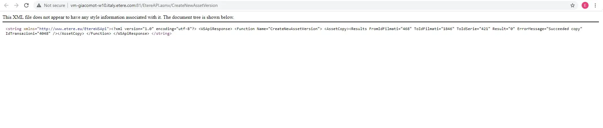 <string xmlns="http://www.etere.eu/EtereWSApi"><?xml version="1.0" encoding="utf-8"?> <WSApiResponse> <Function Name="CreateNewAssetVersion"> <AssetCopy><Results FromIdFilmati="468" ToIdFilmati="1846" ToIdSerie="421" Result="0" ErrorMessage="Succeeded copy" IdTransazioni="4048" /></AssetCopy> </Function> </WSApiResponse> </string>