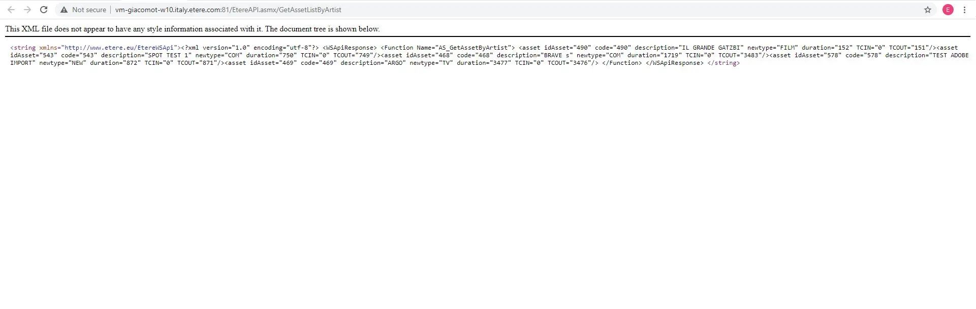 <string xmlns="http://www.etere.eu/EtereWSApi"><?xml version="1.0" encoding="utf-8"?> <WSApiResponse> <Function Name="AS_GetAssetByArtist"> <asset idAsset="490" code="490" description="IL GRANDE GATZBI" newtype="FILM" duration="152" TCIN="0" TCOUT="151"/><asset idAsset="543" code="543" description="SPOT TEST 1" newtype="COM" duration="750" TCIN="0" TCOUT="749"/><asset idAsset="468" code="468" description="BRAVE s" newtype="COM" duration="1719" TCIN="0" TCOUT="3483"/><asset idAsset="578" code="578" description="TEST ADOBE IMPORT" newtype="NEW" duration="872" TCIN="0" TCOUT="871"/><asset idAsset="469" code="469" description="ARGO" newtype="TV" duration="3477" TCIN="0" TCOUT="3476"/> </Function> </WSApiResponse> </string>