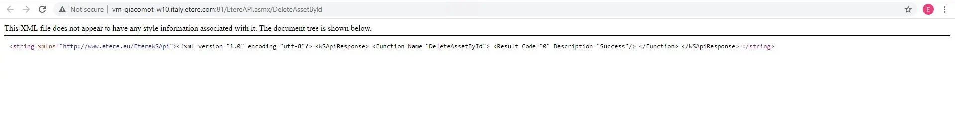 <string xmlns="http://www.etere.eu/EtereWSApi"><?xml version="1.0" encoding="utf-8"?> <WSApiResponse> <Function Name="DeleteAssetById"> <Result Code="0" Description="Success"/> </Function> </WSApiResponse> </string>