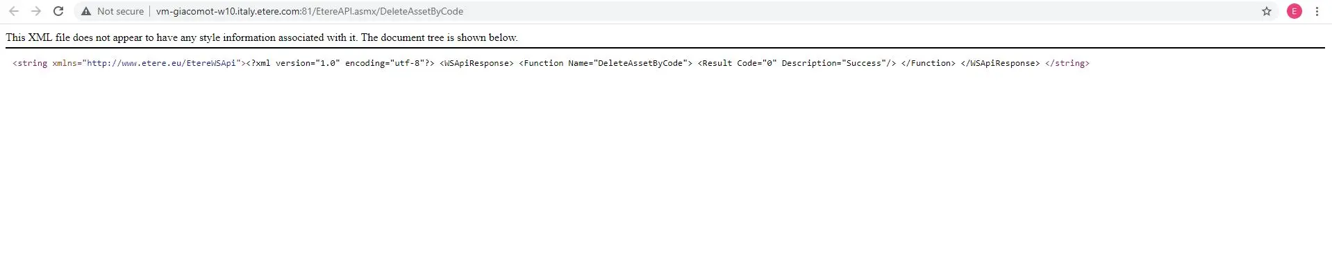 <string xmlns="http://www.etere.eu/EtereWSApi"><?xml version="1.0" encoding="utf-8"?> <WSApiResponse> <Function Name="DeleteAssetByCode"> <Result Code="0" Description="Success"/> </Function> </WSApiResponse> </string>