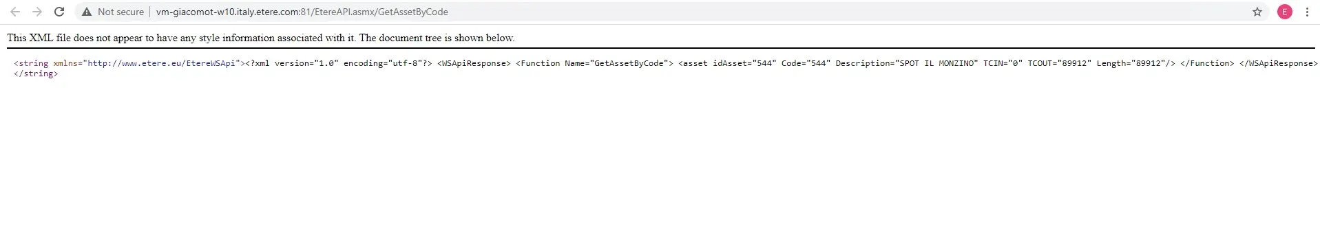 <asset idAsset="544" Code="544" Description="SPOT IL MONZINO" TCIN="0" TCOUT="89912" Length="89912"/> </Function>
