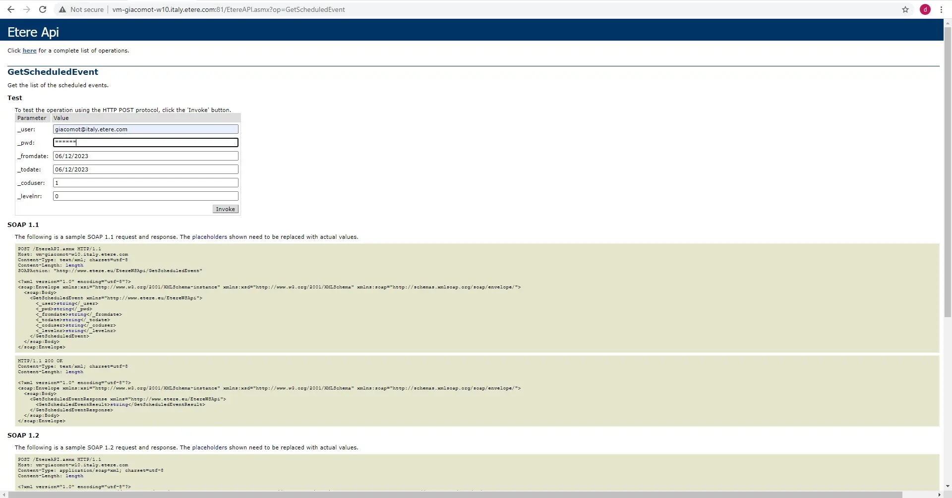 <string xmlns="http://www.etere.eu/EtereWSApi"><?xml version="1.0" encoding="utf-8"?> <WSApiResponse> <Function Name="AS_GetScheduledEvent"> <Schedule><Event><eventid>7234</eventid><channel>1</channel><level>0</level><date>2023-06-12T00:00:00</date><time>00:00:00.00</time><assetcode>1836</assetcode><assetid>1836</assetid><title>SPOT X TRIAL</title><partnr>0</partnr><type>COM</type><status>I</status><duration>00:00:12.06</duration></Event><Event><eventid>7233</eventid><channel>1</channel><level>0</level><date>2023-06-12T00:00:00</date><time>00:00:12.06</time><assetcode></assetcode><assetid>0</assetid><title></title><partnr>0</partnr><type>NOOP</type><status>I</status><duration>23:59:47.19</duration></Event></Schedule> </Function> </WSApiResponse> </string>