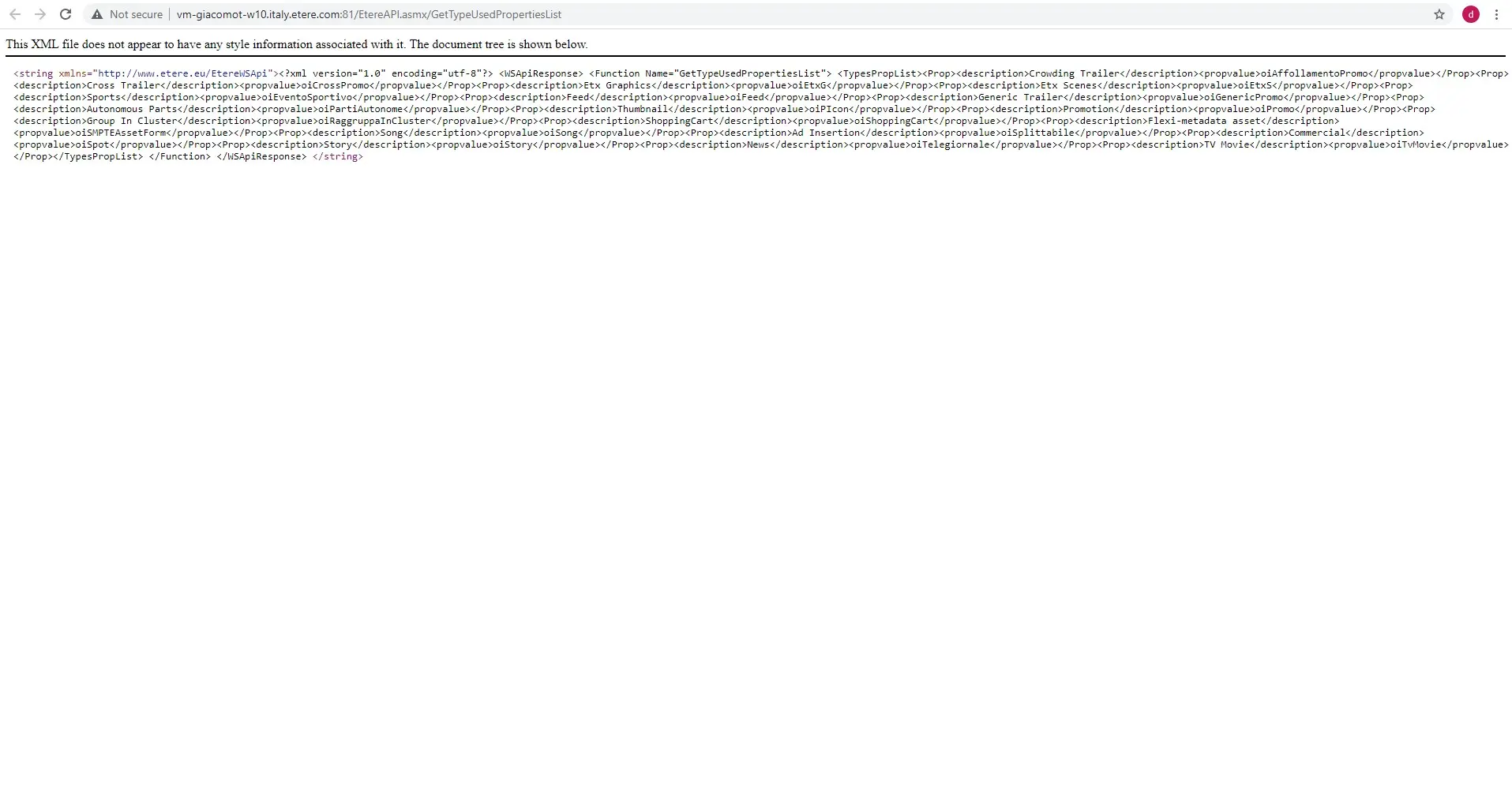 <string xmlns="http://www.etere.eu/EtereWSApi"><?xml version="1.0" encoding="utf-8"?> <WSApiResponse> <Function Name="GetTypeUsedPropertiesList"> <TypesPropList><Prop><description>Crowding Trailer</description><propvalue>oiAffollamentoPromo</propvalue></Prop><Prop><description>Cross Trailer</description><propvalue>oiCrossPromo</propvalue></Prop><Prop><description>Etx Graphics</description><propvalue>oiEtxG</propvalue></Prop><Prop><description>Etx Scenes</description><propvalue>oiEtxS</propvalue></Prop><Prop><description>Sports</description><propvalue>oiEventoSportivo</propvalue></Prop><Prop><description>Feed</description><propvalue>oiFeed</propvalue></Prop><Prop><description>Generic Trailer</description><propvalue>oiGenericPromo</propvalue></Prop><Prop><description>Autonomous Parts</description><propvalue>oiPartiAutonome</propvalue></Prop><Prop><description>Thumbnail</description><propvalue>oiPIcon</propvalue></Prop><Prop><description>Promotion</description><propvalue>oiPromo</propvalue></Prop><Prop><description>Group In Cluster</description><propvalue>oiRaggruppaInCluster</propvalue></Prop><Prop><description>ShoppingCart</description><propvalue>oiShoppingCart</propvalue></Prop><Prop><description>Flexi-metadata asset</description><propvalue>oiSMPTEAssetForm</propvalue></Prop><Prop><description>Song</description><propvalue>oiSong</propvalue></Prop><Prop><description>Ad Insertion</description><propvalue>oiSplittabile</propvalue></Prop><Prop><description>Commercial</description><propvalue>oiSpot</propvalue></Prop><Prop><description>Story</description><propvalue>oiStory</propvalue></Prop><Prop><description>News</description><propvalue>oiTelegiornale</propvalue></Prop><Prop><description>TV Movie</description><propvalue>oiTvMovie</propvalue></Prop></TypesPropList> </Function> </WSApiResponse> </string>
