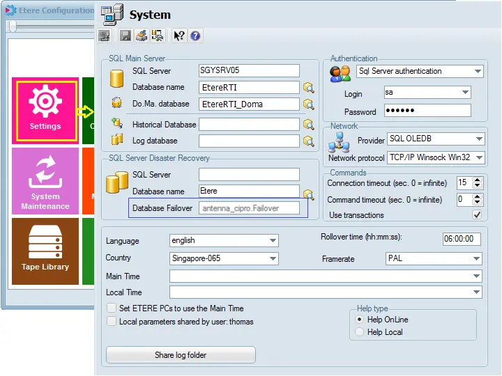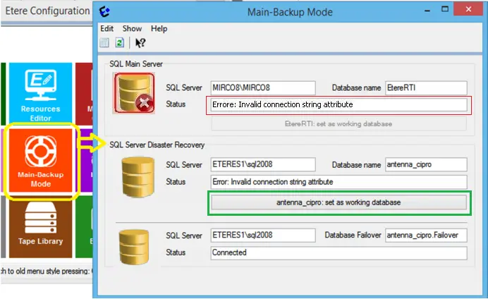 You can click on the "Main – Backup Mode" icon to view the Main and Backup (Disaster Recovery) database settings of the Etere system.