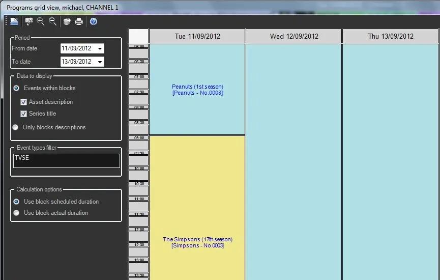 The "Programs Grid" tool provides a custom view on specific program types (e.g. TV Seasons) featured on a certain scheduling period, its filtering and visualization options include: