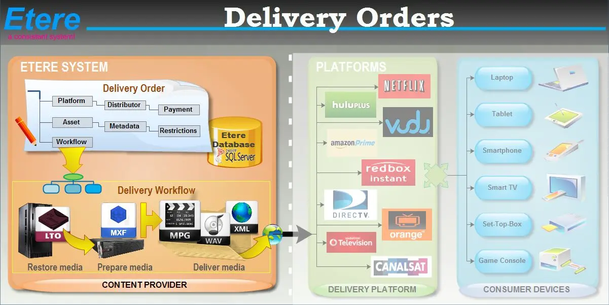The Delivery Orders module enable content providers (e.g. broadcasters, television programmers, movie studios, etc) to carry out the distribution of their content over a variety of media platforms (e.g. Netflix, Hulu Plus, Amazon Prime, Redbox Instant, Vudu, Vodafone TV, CanalSat, Orange Nouvelle TV, etc). Delivery Orders allows to specify all delivery conditions such as licensee, platform, metadata, asset(s), and workflow to be executed (e.g. to automatically adjust content according to the technical requirements of a certain platform). Delivery orders managed in this module have the following characteristics: