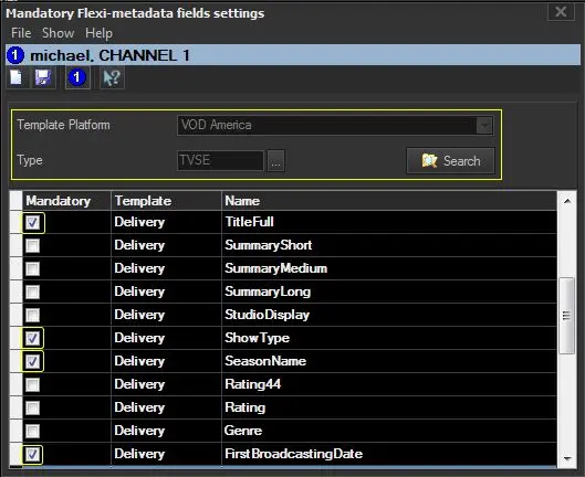 The "Mandatory SMPTE Metadata Fields" form allows defining the metadata (e.g. TitleFull, SummaryShort, ShowType, etc) that must be compulsory filled to deliver an asset of a certain type (e.g. TV season) over a certain platform.