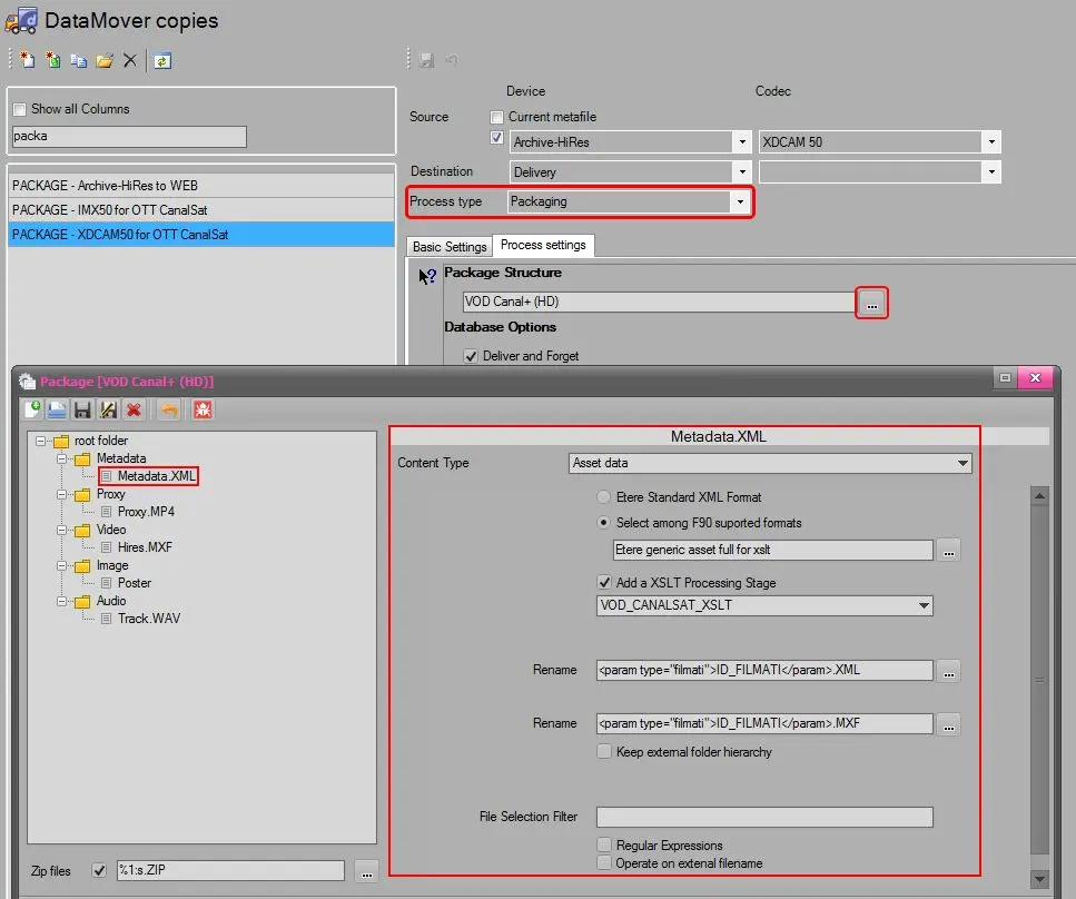The DataMover Copy - Packaging action allows generating a zip file containing all required files (e.g. video, audio tracks, xml metadata, poster, etc.) and put file into a given directory (e.g. shared Ftp site).