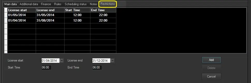The "Restrictions" tab allows defining one or more date ranges for which the purchased program (i.e. single/season program) will be allowed to be used (e.g. transmitted), including the definition of a specific time slot for each period.