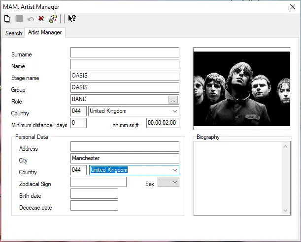 Relevant data regarding artists (e.g. name, country, stage name, group, role , etc) can be stored into the database and can be retrieved when necessary.