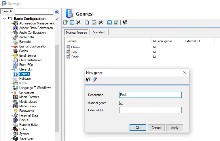 Genre (Etere Configuration > Settings > Basic Configuration > Genres)