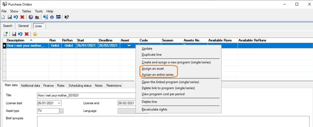 Once the purchase order has been created and the order line defined, it can be assign to purchased rights by using the "Assign an asset" or "Assign an entire season" functions available in the toolbar:
