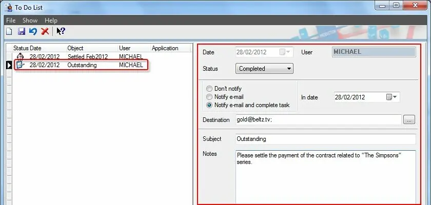 The "ToDo Notifications" tool allows to easily create reminders to be automatically delivered via e-mail at specific times, for example, to remind the accountancy department to perform the payment of the purchased rights.