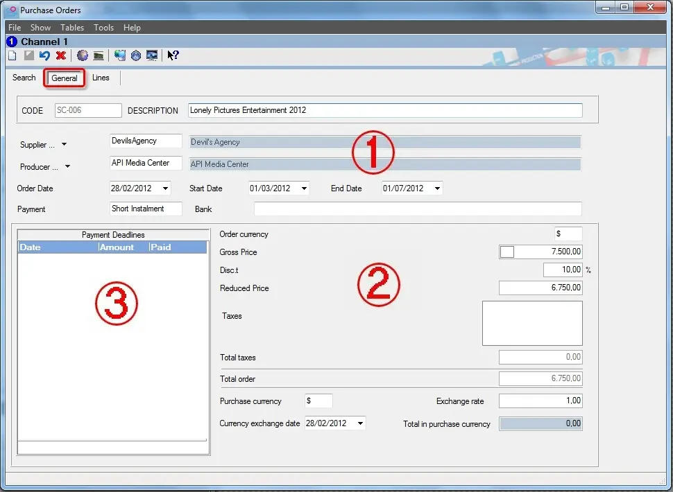 Description : Input the producer (e.g. agency) related to the purchase order. The search is performed across the Personal Data database when click on the [Agency].
