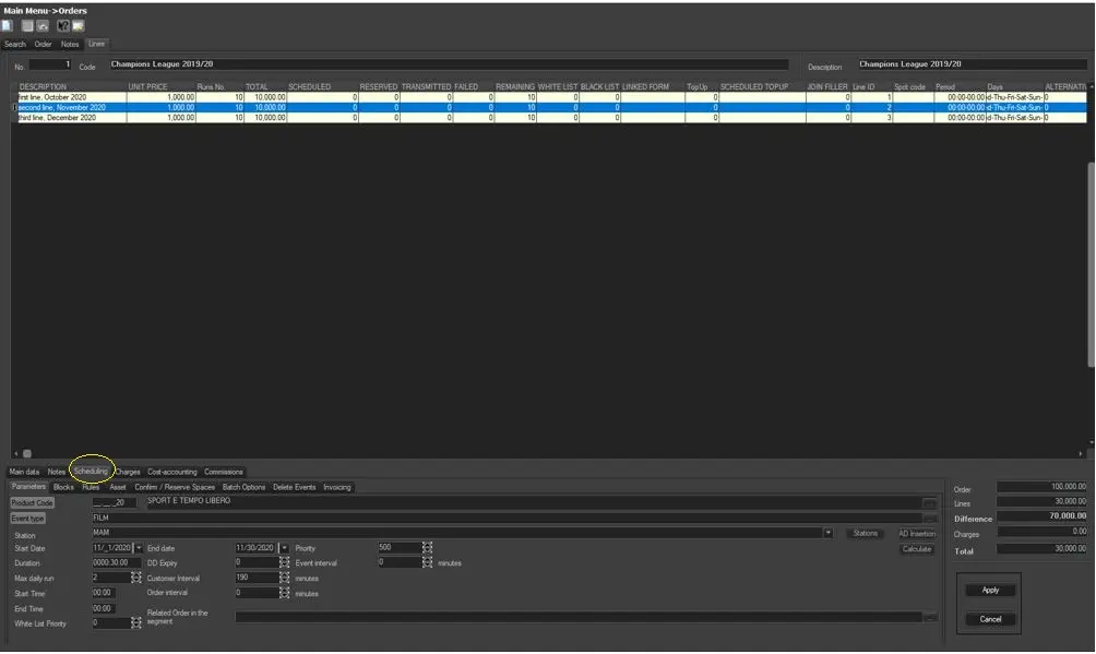 Once all the relevant information has been compiled in the Main Data tab, you are able to schedule the order by reserving the broadcasting space and assign the related assets to the order. in order to perform this operation, simply compile the next parameters: