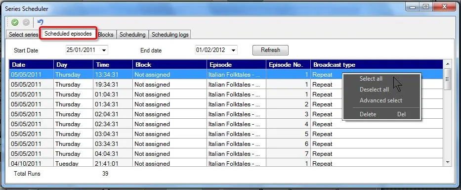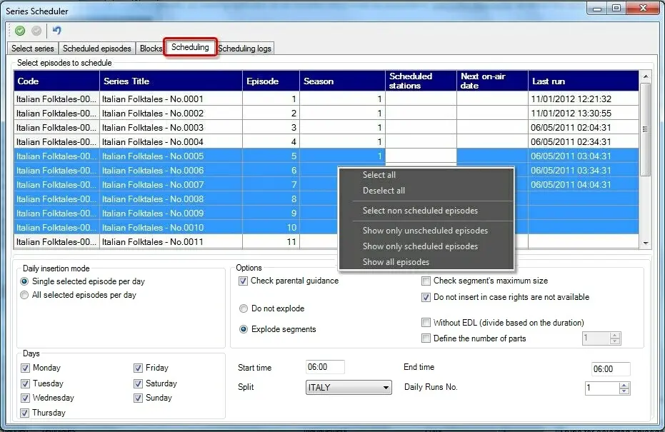 Under the Scheduling tab, select the exact episodes to be scheduled by right-click and select the following functions: