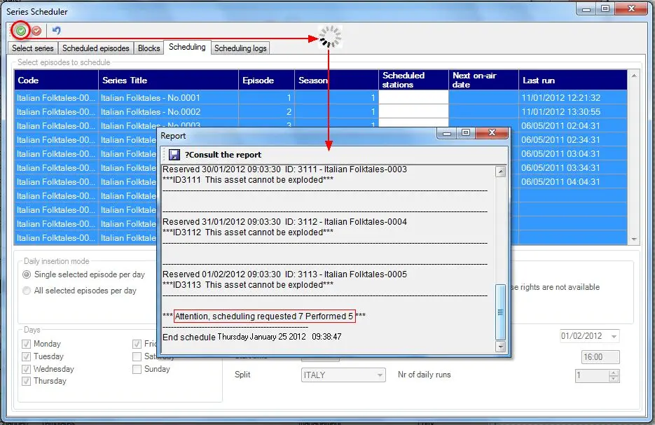NB: if the “All selected episodes per day” parameter is enabled or disabled when you exist from Scheduling tab, the last status is saved when you start the Scheduler. It is possible to repeat episodes within the same day by increasing the ''daily runs number' parameter.