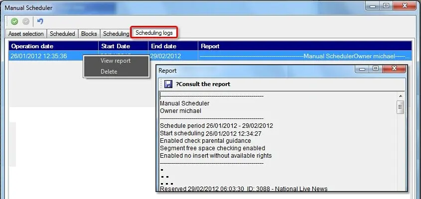 •View report: Show a detailed log of all the operations (e.g. insertions, warnings, errors) related to the selected scheduling operation.