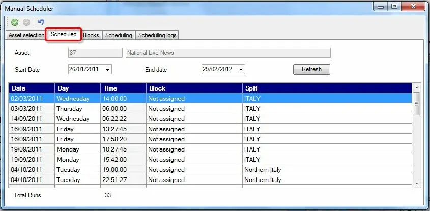 The Scheduled tab display a list containing all the schedule appearances of the selected asset over the selected period. For each scheduled asset it display the date, day, time, block, and split network on which it has been programmed.